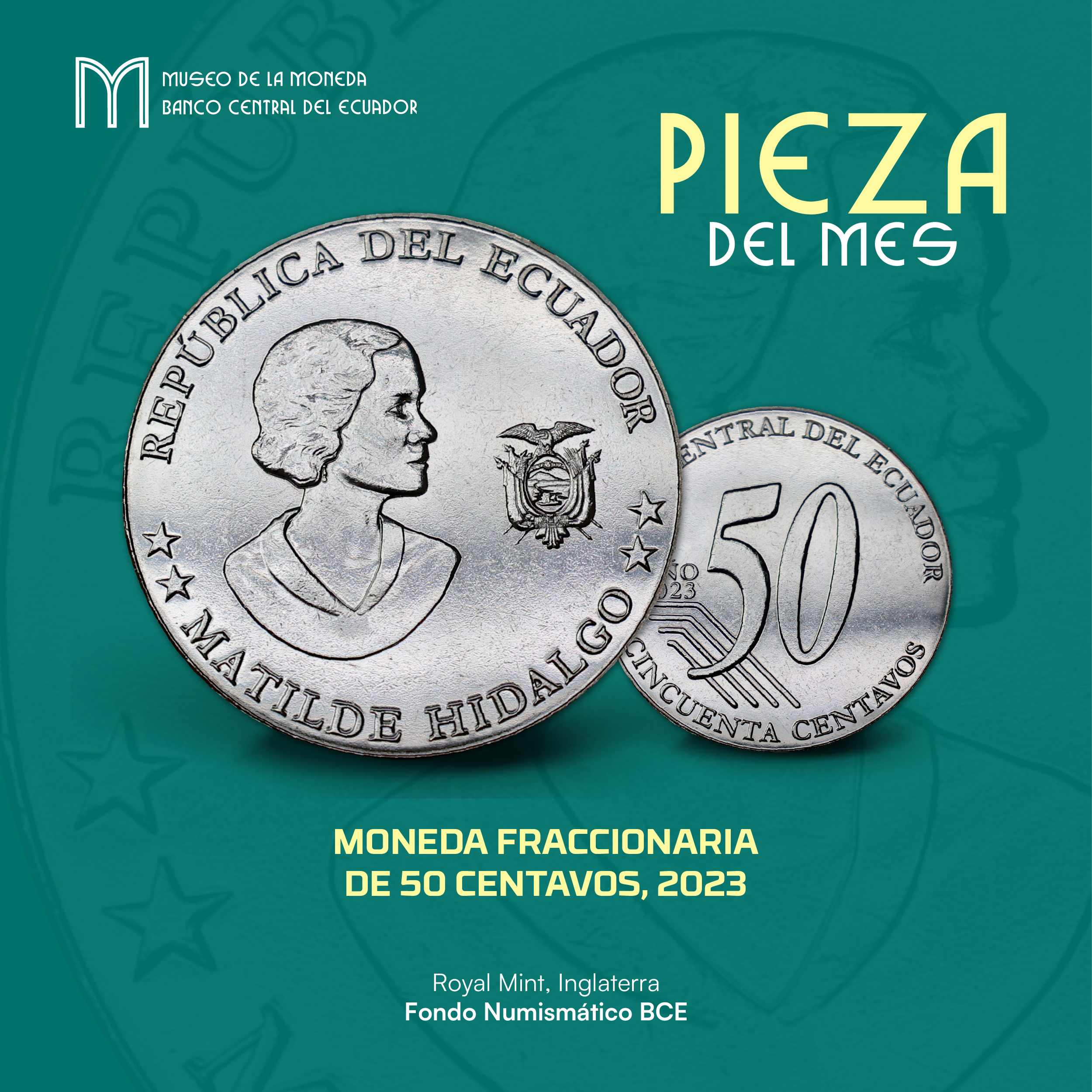 Como pieza del último mes del año 2025, en el Museo de la Moneda presentamos la moneda fraccionaria de 50 centavos con el busto de Matilde Hidalgo de Procel (1889 – 1974), la cual forma parte de la última serie de monedas acuñadas en el 2023-2025 por la Casa de Moneda Royal Mint del Reino Unido, esta emisión tiene como objetivo reemplazar progresivamente las monedas deterioradas y asegurar la provisión de moneda fraccionaria a nivel nacional. (Banco Central del Ecuador, 2023)