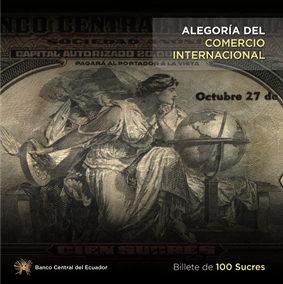 Finalmente, en el billete de 100 sucres podemos observar en la viñeta principal la alegoría del comercio internacional, con una figura femenina que probablemente personifica al comercio al estar representada con una rueda alada y un globo terráqueo, aludiendo al transporte, la velocidad y el progreso mundial.