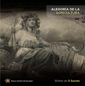 Así, el billete de 5 sucres corresponde a una alegoría de la agricultura de las zonas templadas con la representación de la diosa Ceres según la mitología romana y Démeter de la mitología griega, que se encuentra en posición sedente, portando en su cabeza una girnalda de hojas de viñedos. Entre sus atributos están las espigas símbolo de fecundidad y la hoz símbolo de la cosecha.