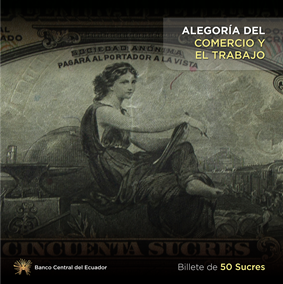 En el billete de 50 sucres por su parte podemos observar como viñeta principal una alegoría al comercio y al trabajo. La figura femenina representada probablemente alude a Aequitas, que en la mitología romada es la diosa del comercio justo y los comerciantes honestos. Los atributos del yunque y el globo terráqueo podrían denotar el comercio mundial y el trabajo. Esta alegoría está inspirada probablemente en la obra de arte titulada "L'Art et la Littérature" fue realizada por William-Adolphe Bouguereau en 1867.