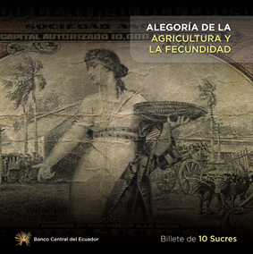 En el billete de 10 sucres se presenta una alegoría de la agricultura de la zona tropical y la fecundidad. Podemos observar una representación de una figura femenina que probablemente alude a Ceres o Démeter. Entre sus atributos se pueden observar el gesto de fecundación del suelo con sus semillas, mientras que porta un canasto, luciendo un pecho destapado símbolos de fecundidad.