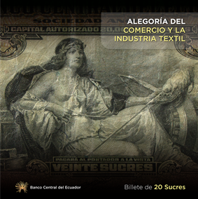 El billete de 20 sucres corresponde a una representación alegórica del comercio y la industria textil. En en el centro del billete se observa la representación de una figura femenina que alude probablemente a Atenea, diosa griega que al estar representada con el huso para el hilado se la conoce también como patrona de las hilanderas. Según el catálogo de la American Bank Note Company, esta alegoría se encuentra dentro de la categoría del comercio y la industria de textiles (Griffiths 1958, p.52).